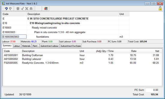 - Full detailed labour, material, plant, subcontract with every aspect of cost accessible and adjustable to suit local needs and requirements.