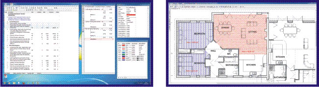 The screenshot above shows Vector with the bill, measurements, current CAD measurement item properties, take-off styles and drawing all displayed concurrently on a twin screen setup.